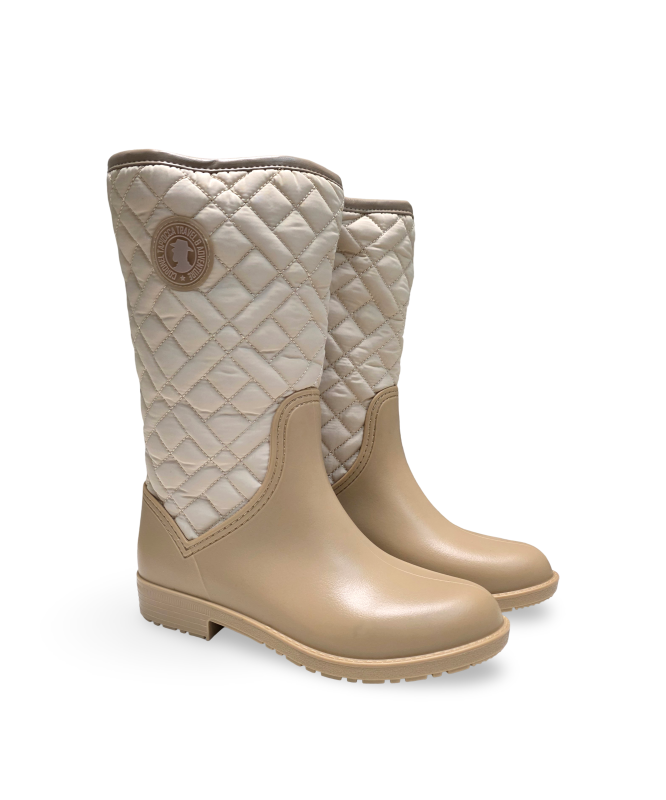 Bota cano tipo galocha com tecido no cano e fecho lateral