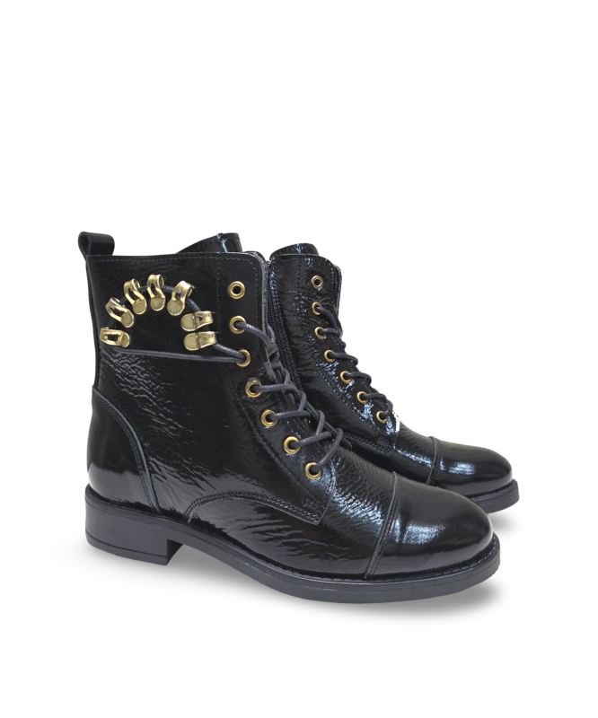 Bota verniz pele estilo militar com cordão com detalhe no cano e fecho